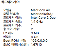 2. 이제 plist 파일을 수정해줄 건데 여러분의 맥북 버전을 알아야 하니 좌측 상단의 사과 모양을 누르고 '이 Mac에 대하여'를 눌러줍시다. Mac 기본 정보창 아래에 시스템 리포트를 클릭하시면 모델 식별자에 여러분의 모델이 나오니 잘 외워두시면 되겠습니다.