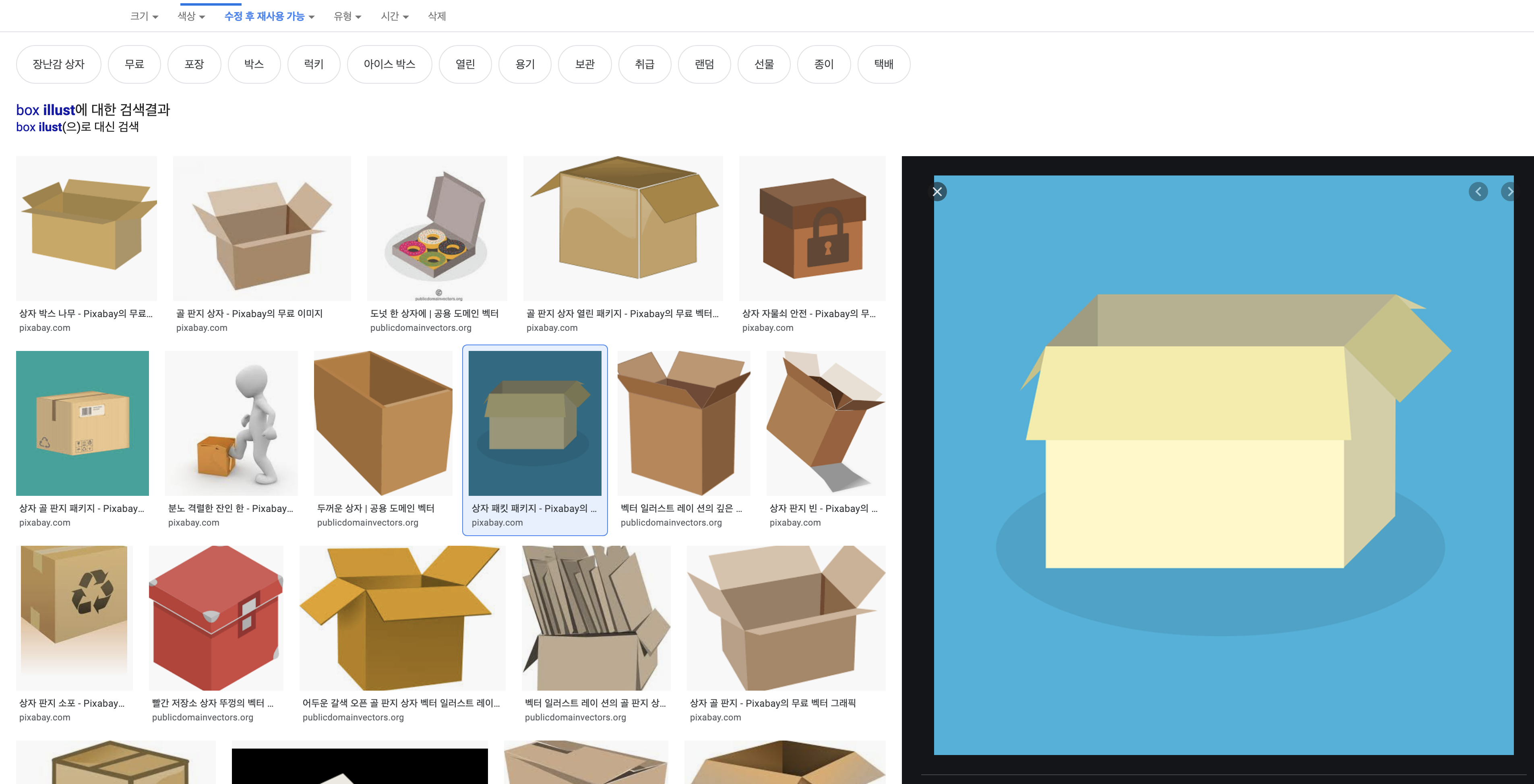 저는 가장 먼저 고프로 폴더를 만들어 보기로 했는데, 뭔가 상자 안에 고프로 담겨 있는 이미지가 좋을 것 같아 상자 일러스트를 구글에서 구했습니다. 참고로 구글은 저작권 범위를 지정하여 검색할 수 있으니 참고해 주시길 바랍니다.