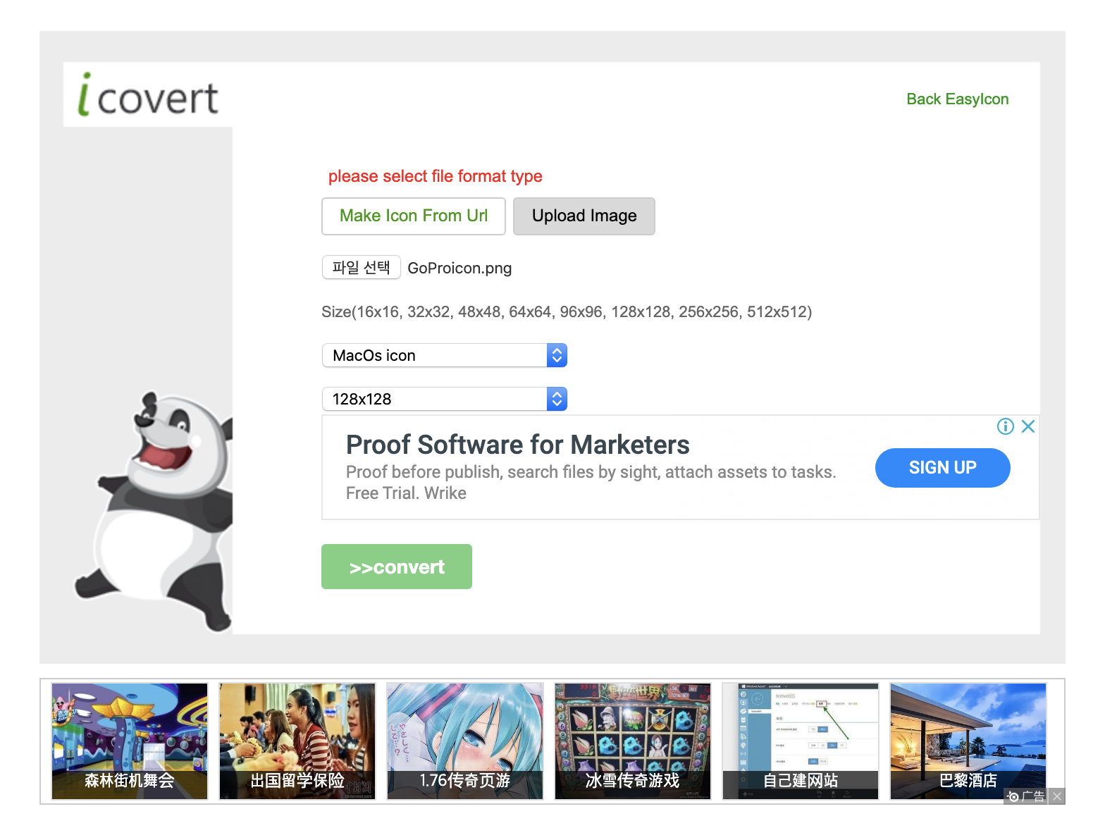 파일을 선택해 주신 후, MacOs icon, 128x128에서 초록색 컨버트 버튼을 누르면 icns 파일이 다운로드 됩니다.