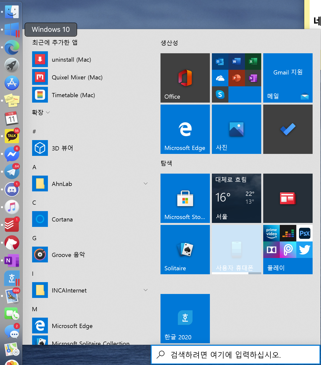 이렇게 패러렐즈를 설치하고 동시 실행모드를 실행한 다음, 윈도우 아이콘을 눌러본 모습입니다. 윈도우 버튼을 누르면 나오는 그 창이 보이네요.