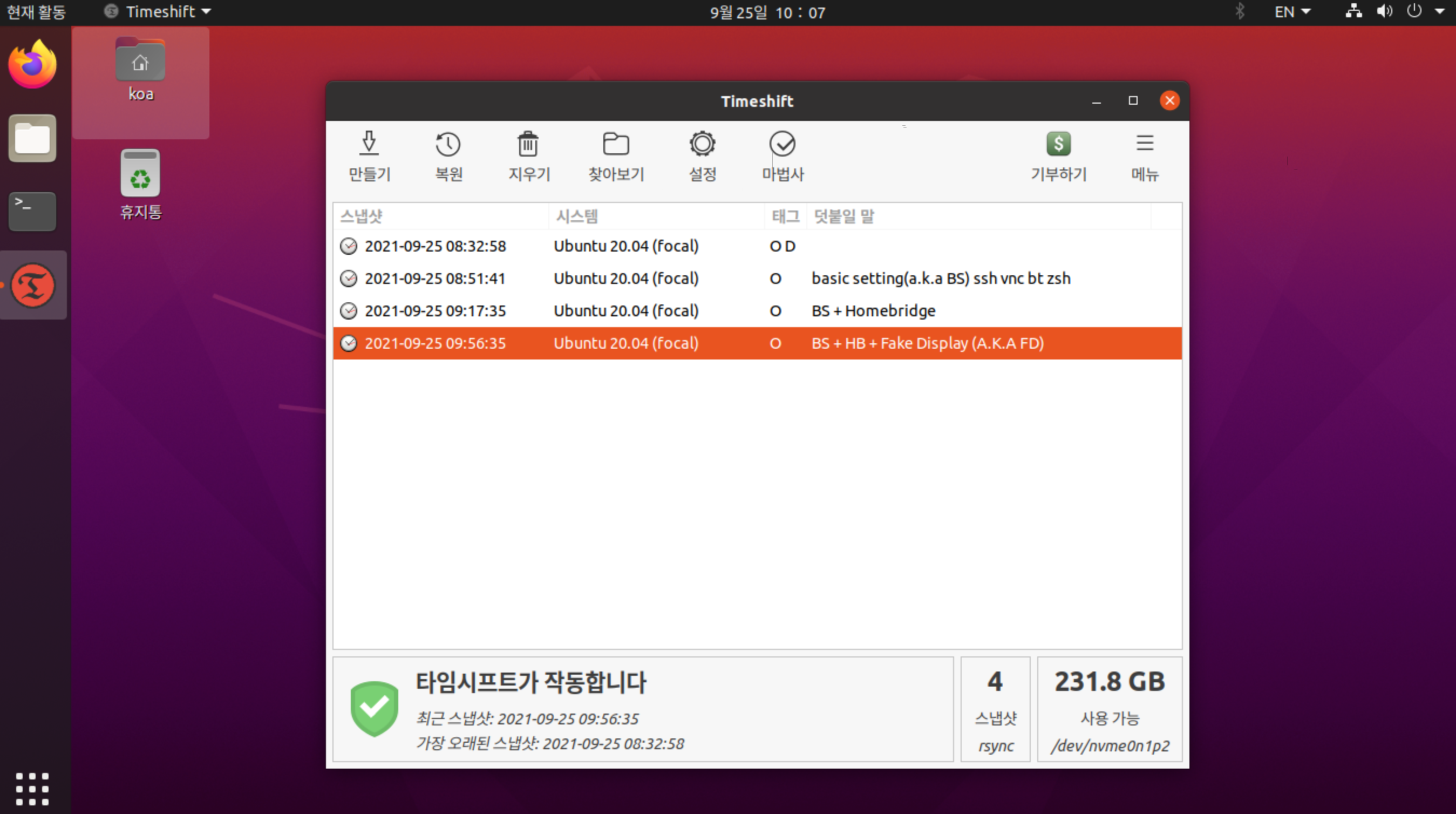 재설치만 며칠 내내 하니까 스트레스를 너무 받아서 검색에 검색을 거듭하다 타임시프트라는게 있어서 하나씩 구현할 때마다 스냅샷 만들고 있다.. 이 글을 보는 사람들도 후회하지 말라는 의미에서 남긴다.