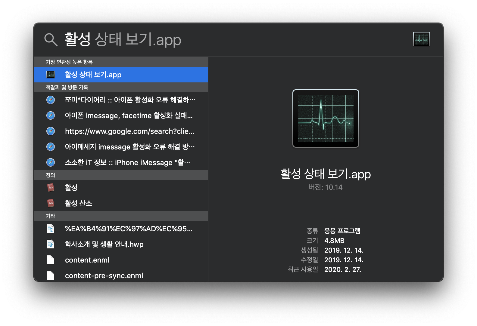 을 이용하여 spot light를 켜주시고 "활성 상태 보기" 앱을 실행해 주시면 됩니다.
