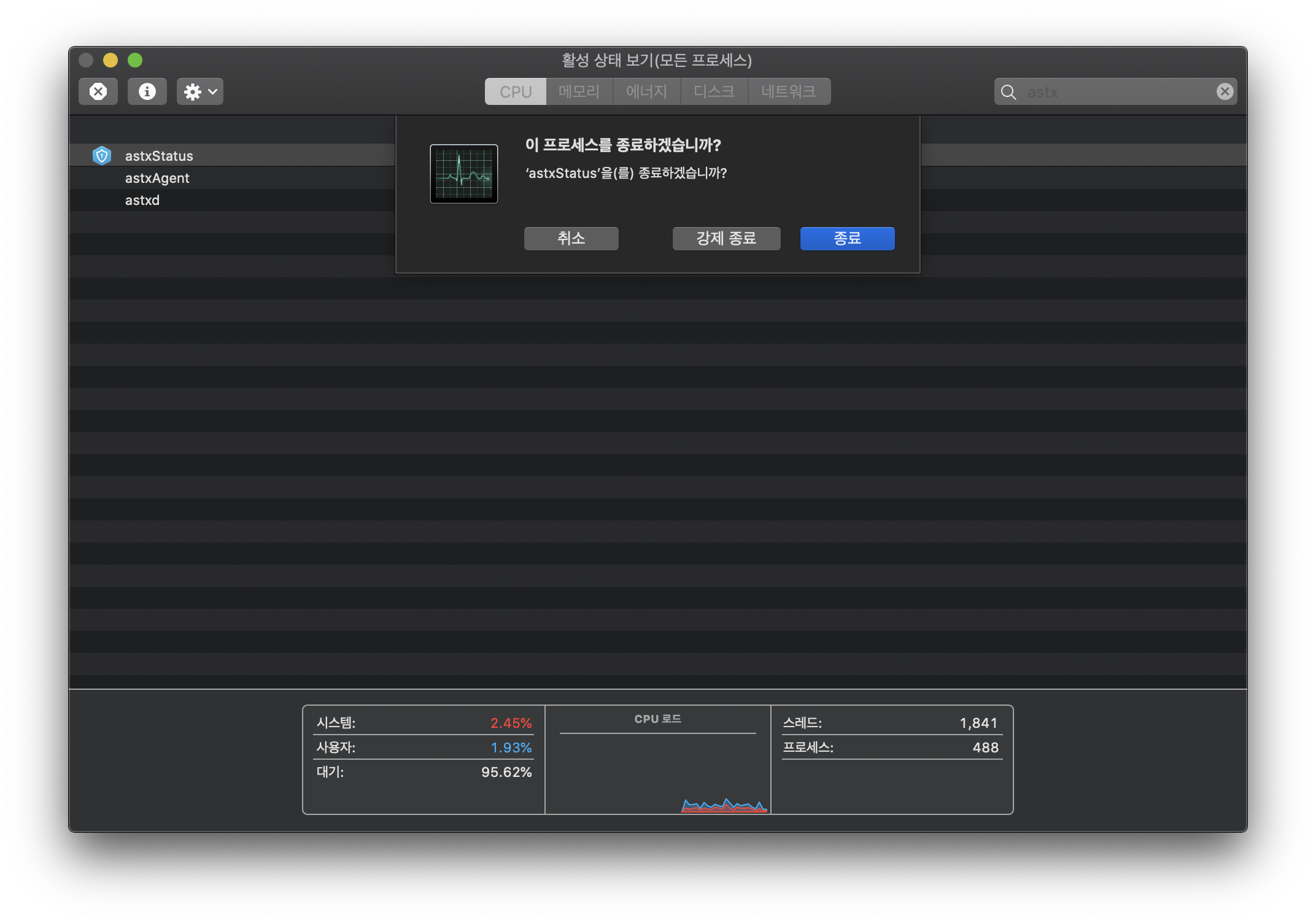 강제 종료를 눌러 주시면 상단 트레이에 안랩 프로그램이 사라지고,