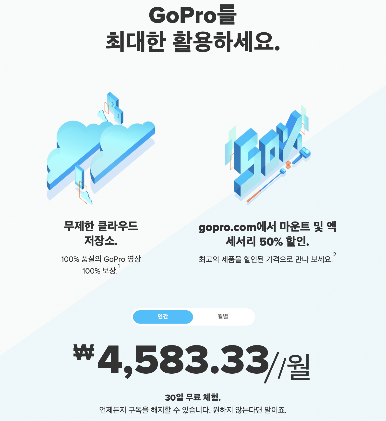고프로 PLUS는 월 5,500원, 혹은 연 55,000원을 지불하여 이용할 수 있는 구독 서비스입니다.